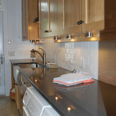 La nouvelle salle de lavage a été aménagée dans l’ancienne sortie de service. Ici aussi tout a été refait à neuf et conçu par cm2 design : l’éclairage, la plomberie, l’électricité et bien sûr l’aménagement. Le bois est à l’honneur avec du rangement pleine hauteur. Une surface de travail en pierre noire crée un beau contraste et maximise l’espace de travail.